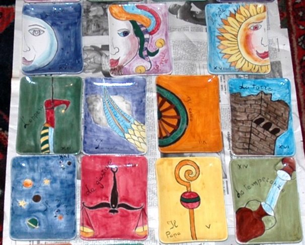 22 Dec 2007 I have been spending a great deal of time over the last few days looking at tarot designs on such artwork sites as Deviantart, Elfwood and epilogue.net. There are so many wonderful tarot designs in a number of media and a wide variety of styles. Of course there are also some more pedestrian and unimaginative pieces, but I was constantly surprised by finding interesting artwork. Naturally, as most of these artists are amateurs, they don't necessarily have the will power to follow through and create a complete deck, even of the Majors. Often one of these artists will create a couple of card designs then seem to give up and move on to something else. Perhaps in some cases they might have completed a deck but not thought to upload them onto the artwork site. I decided to follow up by emailing a couple of artists to see if they had been able to complete a deck as the examples I had seen were quite wonderful. There are even a few that I would certainly be happy to publish in my series. 22 Dec 2007 A few months ago some members of the Tarot Association of the British Isles came to visit me and see something of my tarot collection and get some idea about my work. They very graciously listened to me chatting about my interests in tarot as art, and let me show them some items that especially interested me. We had a nice discussion and I resisted the impulse to bombard them with images by showing them hundreds of tarot one after another. Anyway, yesterday I found that they had written up an account of their visit for their Yule Ezine. This is an online tarot magazine which is available to their members through their website www.tabi.org.uk T.A.B.I. members have a wide interest in tarot. It seems a very positive and active organisation, organising conferences and various study groups. 19 Dec 2007 I recently bought an unusual tarot item - not a deck of cards, set of prints, or even a book with tarot designs - but a set of hand decorated tarot plates. These I managed to buy for a really modest price from someone in Italy. The postage cost more than the set of plates, however, sadly one was cracked into pieces because of inadequate packaging, but it is rather nice to have even an incomplete set. The plates are about 6 by 4.5 inches (160 by 120 mm)and have been hand painted and then glazed and fired so the image is under the protective glaze and not on the surface. The major arcana designs are quite minimalistic and brightly coloured. I am not sure if this was a one-off piece of craftwork or if this was produced commercially. The staining and spill over of paint onto the backs of the plates make me think it was made by an amateur. If so I seem to have bought rather a lot of someone's time at a knockdown price! Perhaps they will take comfort that this has found a home where it will be appreciated.