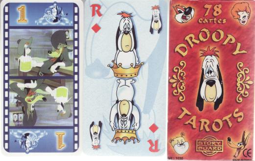 24 September 2008 I don't usually buy Jeu de Tarot, the French card game, as these do not usually incorporate any tarot imagery, even in the trumps, but I could not resist buying the Droopy Tarots when it came up on an Ebay auction recently for a modest price. Droppy was a well known cartoon character (MGM not Disney). The trumps include frames from some of the cartoons while the other cards have redrawn images of Droppy and some of the other characters from the cartoon series.