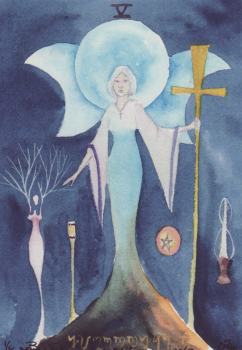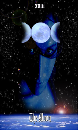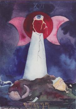 19 Nov 2007 Some tarots come with the most amazing names - some of which one could not make up if one tried. I suppose all the easy ones are taken - Celtic, Grail, Imagination, Archetypes, Greenwood, Indian, Sinister, Gothic, and so on. Who could have thought up the name 'Indigo Witch' ? Well I know, because I now have the Indigo Witch Tarot created by Beth Seilonen in the USA. Two months or so ago I bought her Theban Tarot, so could not resist her latest creation. This is painted in watercolours on a textured watercolour paper and then printed onto very thin paper stock in small editions. I have number one of an edition of eight copies and each card is signed and numbered by the artist. This is not a deck for tarot readers, as it would not survive long being shuffled or moved around on a table top, but entirely an art deck. Every card has a double horned moon in the upper centre. Another symbol on each card (apart from the Fool) is a tree woman. The skies are an intense midnight blue. There is a complexity to the symbolism that makes me think there might be some narrative behind the imagery. The Tower is a powerful and original image, with an eye in the bloody moon from which cracks descend down into the tower itself. The tree woman (shown on the left) is bent over as if by a strong wind. The witches' tools lie smashed on the ground below. Now there must be some story behind that !