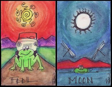 7 August 2008 I have most of Beth Seilonen's tarots. These are produced in small limited editions. Last week I noticed she was selling some prototype decks, which were her original artwork. These were experiments in oil pastels. Usually she works in watercolours or pen drawings. I was very drawn to her Froggy Arcana and bought this. It is a one off. Perhaps in time she will make a frog tarot to publish as one of her limited editions. There are surprisingly few frog tarots! but many cat tarots, and even a few crow tarots (one of which was recently published - see the entry for 3 Mar 2008). Michael Kutzer produced a Frog tarot, but I missed out on that one, so Beth Seilonen's makes a brilliant replacement. The colours are wonderfully vibrant and the imagery is cute and humorous, just as one expects from a froggy tarot.