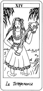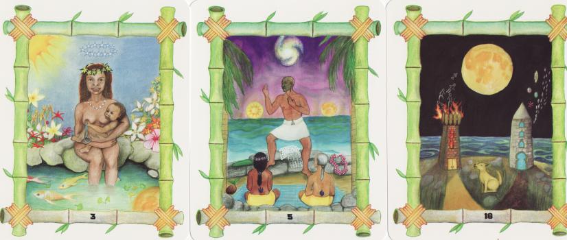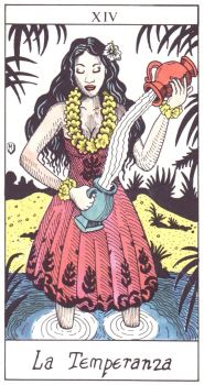 5 Mar 2008 Sometimes, despite my continual researching and investigating I miss a tarot, as if it was in ones blind spot. Well today I have filled in one of these gaps, the Tarot Pacifico created by Kirsten Muskat and published in 2004. Luckily there were some decks left, as the edition was one of 350. They appear to have been created using those watercolour pencils, with a sparing use of water. The little white booklet tells us that the 'Pacifico' of the title does not relate to Pacific Ocean culture but to the concept of peace, and gentle reflection. The booklet even states that "these cards are not intended to be used for fortune telling" ! The artwork is by Sabrena Pfaffly, an artist living in Colorado. Each card has a border formed of bamboo and the imagery seems to me to be very much drawn from Pacific Ocean cultures, and Hawaian, Maori, South Sea Island, even Japanese references show up in these luminous cards. The cards are big and wide and the artwork is delightful and engaging.