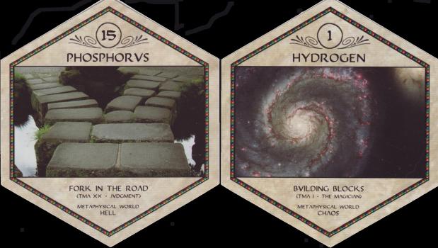 27 Dec 2007 Just over a month ago I got a copy of the hexagonal deck the Tarot of the Golden Desert, and today another six sided deck has arrived, the Elemental Hexagons. This is not a conventional tarot deck as it has 60 cards, however, 22 of them are associated with and named as the 22 Major arcana. Each card is associated with one of the chemical elements from the periodic table. There are divisions into sections but these are not related to nor do they embody the Minor arcana structure of suits. I don't usually collect decks with a loose tarot structure, being a bit of a purist I suppose, but this one captured my attention and interest because of its use of the chemical elements. I don't immediately understand all the associations the creator here makes between an element and a Major arcana. Some are straightforward enough - Sun with Gold, Silver with the Moon card, even perhaps Hydrogen as the Magician, but Phosphorus as Judgement, and Lithium as Justice seem a bit opaque to me. Anyway, it comes in a rather wonderful hexagonal box and is relatively inexpensive.