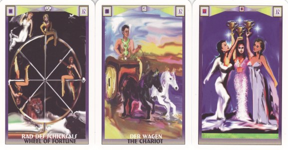 31 July 2008 I have just received a Rider Waite clone deck from Germany. This is the Traumtarot or 'Dream tarot', self-published by Isabel. This is a full 78 card deck. The minors are essentially a clone of the Rider Waite imagery but in Isabel's own style. Her majors are created more from her own imagination and dreams. She appears to have created the artwork on a computer using a painting program. This produces a softness to the detail and a blending away of sharp edges, which gives the images a kind of dream-like quality. The cards are quite small and are professionally printed and produced. The titles are in German and English. You can buy copies direct from Isabel Krsnic isabel@krsnic.de