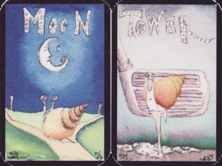 7 November 2008 What do snails have to do with tarot ? And golf tees and balls also? Beth Seilonen dared to ask that question and after much thought she came up with the Tarot of Isabel Snail. Are snails such an unlikely candidate for the honour of a tarot deck? There are many cat tarots, and I doubt that cats have any connection with tarot, neither do Angels, Celts, Mayans, Mona Lisas, Knitting, Pirates, Hedgehogs or even alchemy - so I can easily accept a snail tarot. This is in Beth Seilonen's best humorous style - her snail eyes are wonderfully expressive, and they all have a delicious look of puzzlement, even bewilderment, as they are placed in the various tarot scenarios. Now, I wonder if all the golf courses in Maine are colonised by snails. This is a limited edition of only 24 decks.