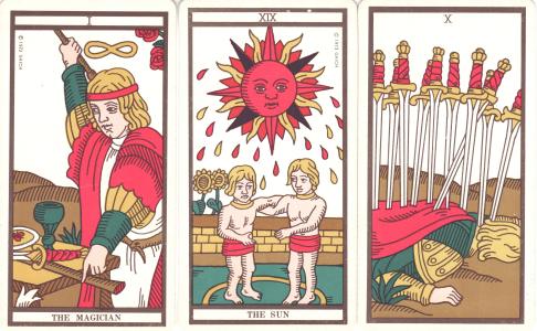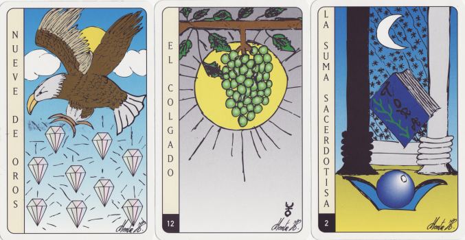 22 October 2008 I now have yet another South American tarot, this time from Argentina. This is the SOL Tarot, a 78 card deck which appears to have been produced by a Doctor Hector Russo (he is a Doctor of Parapsychology not Medicine). I cannot find a date on the item but it seems quite recent. The Majors are renamed and renumbered, but for the most part easily recognisable. Rather than having a little white book, the publisher has added descriptive information on a series of 16 cards.