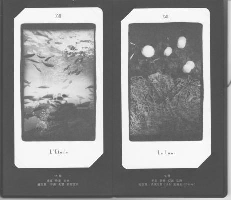 18 July 2008 Fellow collectors often say I am one of these sad cases who looks for the seriously obscure items. Some days ago I obtained the Kosmokrator Tarot (what a wonderful name for a tarot deck!). This is a Japanese majors only deck created from black and white photographs by the artist Muramatsu Katsura. Each image was originally created as large silver gelatine emulsion prints (the older method for printing out black and and white photographs). Here the artist has overprinted two or three different negatives to create the final image (a bit like photoshop layers but done in the darkroom with an enlarger rather than using a computer). The images are quite enigmatic and not immediately recognisable as tarot images. The cards come in a rather stylish concertina like black folder with a silver cover. Thus one can open out the concertina and have all the cards in a line. They are held into the folder by little slits which enable the cards to be easily removed and replaced.