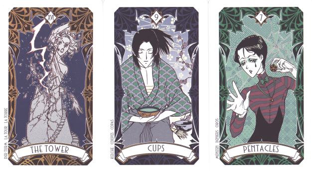 18 September 2008 I recently received the rather expensive Hetalia tarot 22 . This is a self published tarot produced by a Japanese artist named Koze. The designs are conventional but nicely drawn and coloured using a graphics program. I was a bit perplexed by the inclusion of country names on the cards, however a little research on the internet alerted me to the fact that this is derived from a manga called Axis Powers Hetalia, apparently based on the two 20th century world wars. As there is no official tarot issued with this manga, I must assume that this deck is a self published doujinshi (or fan art) deck. This makes it rather rare and justifies the price I paid for it. Decks like this will be impossible to find in a few years time. The deck comes in a solid card box and includes a little booklet. In this booklet are shown the original pen drawings on which the tarot card images are based.