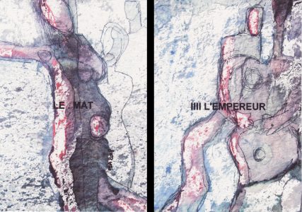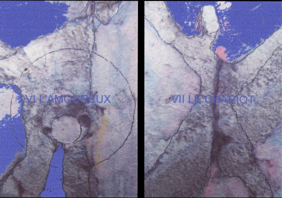 27 June 2008 Yesterday I began printing out the next tarot deck in my series. I will continue with this today. Next week I hope to be able to allocate the time to laminating, cutting into cards, rounding the corners and making up the decks into boxes. Hopefully, this tarot, created in beautiful paintings, will be ready for sale in a week or so. Watch this space ! 25 June 2008 This morning I checked over the statistics for this weblog. For most of this year around 120-280 people were accessing the Weblog every day, but somehow from the 22nd of May the numbers substantially dropped to a range of 70-95 accesses a day. I am not aware of doing anything - changing the style or content of the postings - that can explain this. Perhaps some key link from some other tarot site has been removed. Visability on the Internet is a bit of a lottery it seems. 25 June 2008 Some days ago I received a copy of a new tarot, Tarots de Mai, from the French artist Oda who earlier this year produced her first tarot. See the entry on the weblog for 18 Apr 2008. This new tarot is in the same media and style, but here I find that the figurative element is emerging more out of the abstract. One detects a kind of evolution of form from the mass of prima materia. These two decks wonderfully complement one another.