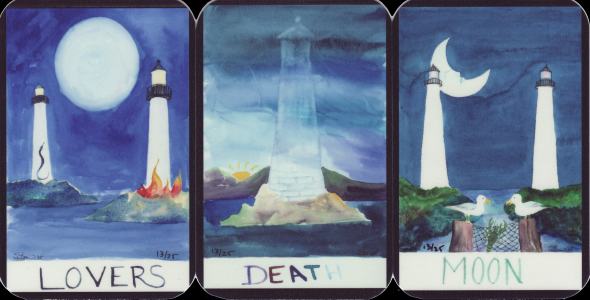24 July 2008 There is a tarot of pirates, more than one of bellydancers, a couple of baseball tarots, a tarot of white (and only white) cats. and even a couple of tarots of postage stamps, but today a tarot of lighthouses arrived in the post. Well, it is not actually called the tarot of lighthouses, but rather it is Beth Seilonen's The Maine Tarot which she started some time ago but only recently released. There is a lighthouse on every card, sometimes more than one. Maine must have a lot of lighthouses ! This is a nicely produced limited edition of 25 copies, which comes in a little black velvet bag inside a solid cardboard lidded box, as do all her recent tarots.
