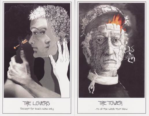 23 October 2008 Beth Seilonen must be the most prolific tarot artist working today. But she is not only prolific, she is also very inventive. She always seems to find a new take on the tarot. Her latest is called Both sides and must have arisen from an observation that many of the majors seem to form pairs. Thus she designed this deck so that these pairs are shown as if the complementary sides of the one image. It is a neat idea and she executes it in simple pen drawings. I am also always on the lookout for new ways for envisaging the Tower, one of the most difficult cards to rework. Here she captures the idea of the Tower just by means of four falling childrens alphabet bricks - I cannot recall seeing that before.