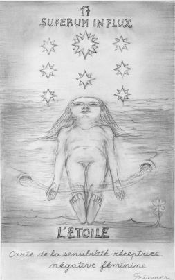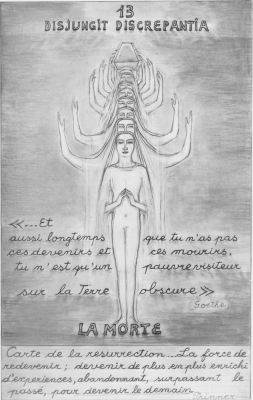 23 July 2008 Yesterday I received a rare tarot which had shuffled its way to and fro across the Atlantic two times before it reached me. I thought it had been lost in the post, but for some weird reason the UK Post Office returned it to the sender as undeliverable ! This would have been the first item I had ever lost in the post, and sadly it was a rare tarot, but happily the dealer sent it back to me and it was delivered safely on the second occasion. It is a rather strange, relatively early tarot from 1971, Le tarot de Prinner, in the form of a portfolio of black and white prints in a folder together with a stapled book of descriptions in French. The original artwork is in pencil as is the text of the book. These have been litho printed. Anton Prinner (1902-1983) was a sculptor working primarily in ceramics. He was apparently originally Hungarian but moved to Paris in 1927. In 1945 he met Picasso who described him as "the small fellow who makes big statues". Picasso nicknamed him the "Small Woodpecker". Prinner developed an interest in the occult and this seems to have led to him working on the tarot designs. I am not sure how many of his tarot portfolios were printed but it would have been sad if this had been lost in the post. The prints are quite large 12.5 by about 10 inches. His imagery is influenced by Eastern spirituality, as in his Death card which shows a series of reincarnations.