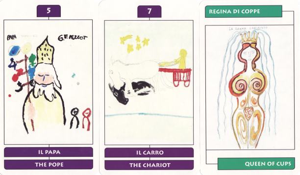 8 Jan 2008 An interesting set of cards arrived today. These are the Tarocchi Psycocarte, the designs for which were produced within an art therapy project at Verona in Italy. The paintings (watercolour or gouache) were made by a number of individuals, none of whom show significant technical abilities. The images were chosen by the editors Luigi Scapini, the well known tarot artist, and Graziella Morandini, the psychiatrist at the Centre of Vicolo Teresa in Verona. Together they have chosen the images to build a tarot. The majors are by a number of different individuals, but the editors have been very wise in giving the sections 1-10 of each suit, and the court cards of each suit to single artists. This produces a coherence in these sections which otherwise could have been problematic. This idea works extremely well. The editors also must have restricted the format within which the art was to be created (to a fixed portrait ratio), and thus one has another degree of coherence. The cards are very large, about 6 by 3.25 inches (150 by 85 mm) with a nice clean design which lets the artwork show clearly. The card imagery while entirely tarot, in some places reveals something of the indivual creator of the images, and various rogue elements or challenging aspect to the painting. The Chariot, for example, shows a white and a black horse, but here the black horse seems to have fallen to the ground. The art therapy patients were obviously made aware of the tarot imagery and some are almost conventional.