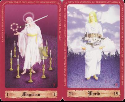 21 September 2008 A few weeks ago I bought the deck Tarot - The Ancient Translation Tool. This is a Biblical Old Testament inspired deck created using computer graphics. Well today I received another Biblical tarot, this time from the opposite end of the Bible, the Tarot of the Revelation again produced using a computer drawing program. The imagery in the Majors draws on the Book of Revelation, often quoting visually from artists such as Durer. This deck is issued in Japan and was created by Christopher Earnshaw, who is much influenced by the American psychic and mystic Edgar Cayce