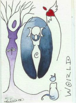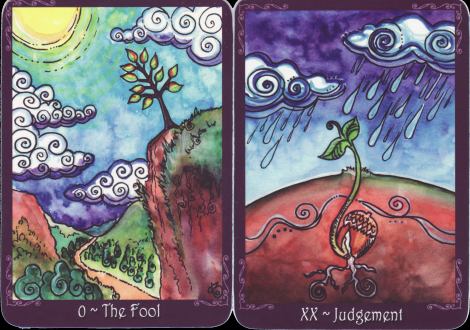26 September 2008 Over the past few months I have been watching on the Aeclectic forum the evolving of Dana Lynn Driscoll's Tarot of Trees. So I was delighted to hear that she had completed the Majors and had decided to issue these as a limited edition, while she worked on the remaining cards for a 78 card deck. This arrived today and is truly glorious. It comes in a little, hand decorated, wooden box. The cards are small and are printed in intense luminous colours. The idea for the deck was to create a tree centred tarot. Here the trees are not decorative background symbols, but instead they reflect to us, through their depictions and gestures, the tarot archetypes. Thus the Fool shows a tree precariously growing on the side of a precipice, the Lovers show two trees intertwining their branches, the Emperor is a tall oak, lording over and protecting seedlings growing below, while Judgement has an acorn sprouting underground and just putting up its firs leaves into the outer world of the elements - perhaps it will survive, or perhaps not. This is a delightfully painted and well thought out deck. I am not sure how many copies Dana will produce, so I am pleased to have been able to buy one.