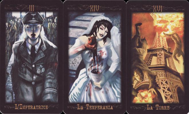 7 Dec 2007 Sometimes one buys a tarot and finds one gets hit with a rather massive shipping charge. One feels a little exploited, until the item arrives and you find it is in a massive wooden box, or some especially heavy packaging. Today my postman struggled up the stairs with the Italian Sine Requie. It is a small deck weighing hardly a few ounces, but it comes with a substantial hardback book weighing a kilo or more. This Tarocchi is actually part of a role playing game which seems to be based on the scenario of the formation of a Fourth Reich after the Second World War. The book provides all the background to the supposed history and no doubt provides the materials necessary to play the game. I am not sufficiently motivated to try and understand this, as the text is in Italian, but it seems to lead us into a world where the Nazis had triumphed. The deck consequently is rather dark in mood. Its title Sine requie translates as "without rest". The Empress is seen in a Nazi style uniform, while the Tower shows the Eifel Tower in Paris being destroyed. Temperance is rather gruesome, depicting a woman in a bridal dress squeezing the blood out of a heart into her goblet or chalice. Temperance has surely never been portrayed in such a bleak way.