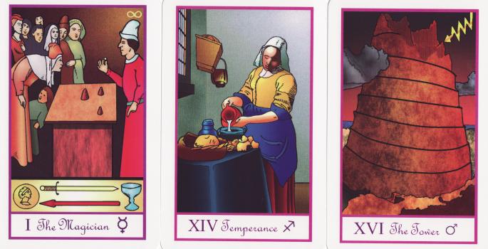 12 Apr 2008 There have been many attempts over the last decades to create a tarot deck based on images from classic paintings. Not that these paintings were in any way inspired by tarot, but only that the creator of the deck found some tarot association in a well known painting or part of a painting. The latest attempt is the Tarot of the Masters just issued by James Ricklef. The artwork for the Tarot of the Masters is drawn in outline from the original paintings. The drawings are very much simplified version of the originals. These have then been coloured, probably using Photoshop or some other graphics program, using a lot of tone gradations and some textures to give some modelling to the forms. This is quite nicely done, producing a uniformity of style across all the artwork on the cards. This solves the problem of using scans of images of the original paintings, as these are all in different styles and formats and difficult to squeeze into standard shaped cards with their usual portrait format. If one bought this deck solely for the artwork, one might be a bit disappointed as the images are, in a sense, caricatures or cartoons of the originals, but the deck rather has to be seen as making its own style. For his Magician he uses a section of the 'Juggler' by Hieronymous Bosch, his Tower draws from Breughel's 'Tower of Babel', while his Temperance takes its imagery from Vermeer's famous 'Milkmaid'.