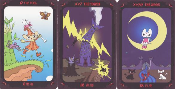 28 May 2008 "Oh no not another cat tarot!" do I hear you say. Just how many cat tarots does a sixty year old man really need? Well this one comes from Hong Kong in China, published this year by Likebulb Studio and is in cartoon style with bold lines and strong colours. I really like the Tower in which not only is the Tower in the form of a cat struck by lightning but also the cat on the lower right.