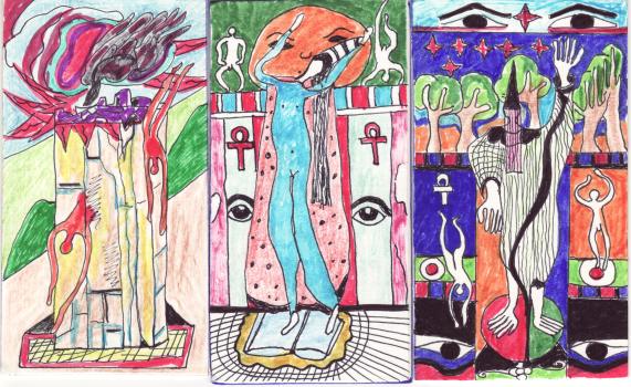 3 September 2008 I have been finalising the new tarot in my Art Tarot series. Hopefully it will be published in the last week of September or early October. I never give advanced details and prefer to wait till I have the decks finished and ready to post out before advertising them on my web site or sending information to those on my mailing list. It is my experience that purchasers of tarot can get rather annoyed by announcements of a tarot before it is ready to ship, as some publishers preannounce months or even a year or so ahead. Setting up this latest deck has taken up a good slice of my time recently so I perhaps have been neglecting this weblog. I will try to make a few postings over the next few days. There never seems to be time to do everything one wishes ! 29 August 2008 Every so often I am able to buy the original artwork for a tarot deck. With well known decks this is, of course, impossible, as the artist usually sells their pictures off at a high price, to recoup the value of all the time they put into their original creations. But I have been able to acquire a few one-off deck designs. Today, I have received a series of 22 card designs made using coloured felt tips on a heavy board. Nothing is known about the origin of these, and though obviously not by a trained or skilled artist, nevertheless, the designs have an integral style, using elongated figures. Most of the cards contain at least one pair of rising and falling figures. The cards are neither titled nor numbered, but in most cases it is relatively easy to assign them to the appropriate arcana. There are a few which are ambiguous, but after I spend some time looking at them I will probably be able to assign them. On a quick examination I can find no indications, signature or other coded information, about the artist or even country of origin. It is good to have a few originals in ones collection.