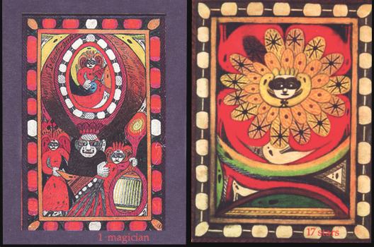 3 November 2008 The Australian Chester Harris produced his Tarot Chesta in 2002. The line work was created in Lino block overprinted on a number of silk screened colour print layers, some cards having gold and silver ink screen printed. There are 78 cards plus one blank and a face card. The cards are large, measuring 100 by 150 mm, and are printed on quality archival stock. An edition of 61 decks were printed. I had thought that the edition had been entirely sold, but I was recently in touch with the artist and it turned out that he still had a small number of copies for sale. Needless to say I bought one. They are relatively expensive, but they are a unique artwork. The designs are very expressive with a subtle humour and the strong bold woodcut like outlines (lino blocks) give them a solidity and strength. Chester Harris conceived the designs in 2000 while on a journey of personal exploration travelling around the North and East of Australia. These are definitely an art tarot, involving thousands of hours of work by the artist, and will be hightly valued in the years to come.