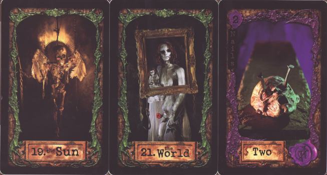 21 Nov 2007 I pushed on yesterday and today with laminating my next tarot. Once I have completed this, I will have to cut the sheets into cards, which takes almost as long - two to three days work. Then only remains the making up into decks. Hopefully I will be able to announce this publication next week. I never announce a deck as being for sale, or accept any payment, until I have the actual decks made up ready to be sent out, otherwise I would end up disappointing and thus losing the confidence of my customers. When I say I have the item available - you can be sure it is actually there as a deck on my shelf ready to be posted out. 20 Nov 2007 The Wormweird Tarot was created by George Higham using retro-tech Victorian stage illusions and waxwork sculptures which were then photographed and used for the tarot images without any post-photography digital manipulation. Higham's artwork has beeen described as 'Steam Punk', a style of fantasy art idealising archaic Victorian technology. The imagery of this deck is full of skulls, skeletons, waxworks, grinning teeth, and wounded or excised eyes. To a sensitive soul this imagery will be rather disturbing, but the more cynical among us will see that it is full of humour and a veritable tour de force of visual jokes. It creates a world of seeming cruelty, madness, decay and death, that also rather engages us through its coherence and underlying structure. It reminded me of the David Lynch film Eraserhead, not that these are in the same style, but that they similarly evoke strange disturbing worlds. The 'Wormweird' of the title evokes the hallucinogenic and poisonous herb Wormwood that is the basis of the greenish drink Absinthe that rotted the brains of many aesthetes especially in fin de siecle Paris. This flows through the symbolism of the whole deck. I mentioned yesterday, that I felt the Indigo Witch Tarot had an underlying narrative, well the Wormweird's narrative is overt and explained in considerable detail in the booklet that accompanies the deck. It is too complex to even attempt a summary, as each of the Majors has about half a page describing the story portrayed in that image, and even the Minors have a paragraph or two devoted to their part in the drama that is Wormweird. This is an amazing deck, which I suspect will only be collected by those interested in Higham's work, or those tarot collectors who are immediately drawn to an artist working creatively with the tarot concept and locating it in their own obsessive world. I suspect people will either love this one or hate it. I, for one, am happily engaged by its wonderful though disturbing imagery. Perhaps, Higham, as a visual artist is expressing the fear of losing ones sight, as he constantly returns to images of empty eye sockets or even a shrunken skull 'crucified' by being nailed through the eyes - totally unsettling to someone whose life is lived through looking at artworks.