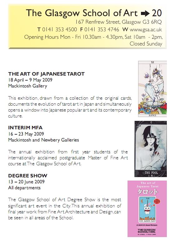 11 May 2009Sadly, I have not been able to find much time over the last few weeks to write up my tarot weblog. I will try and enter some of my new acquisitions onto these pages over the next few days. I have now finished one of the spin offs from the exhibition a video. This DVD format video was created to be a record of my exhibition at the Glasgow School of Art in April 2009. Curated by Ronnie Heeps and Adam McLean, this exhibition in the Rene Mackintosh Gallery was drawn from my collection of original cards and documents the evolution of tarot art in Japan and simultaneously opens a window onto Japanese popular art and its contemporary culture. This professional quality 18 minute video documentary was filmed and edited by Pat Smith. It is written and presented by myself. It gives a good overview of the exhibition and I give a commentary on many of the exhibits. You can buy a copy here. The exhibition now moves to another venue, the new exhibtion space at Kilbirnie Library in North Ayrshire. It will open there in June. 27 April 2009 Last Friday and during part of this week I am working on a video of the Art of Japanese Tarot exhibition. This provides a walk through of the exhibits with a commentary by myself, a piece by Ronnie Heeps and some material shot on the opening night. The response to the exhibition has been very positive. Its situation within the Glasgow School of Art, means that it is primarily reaching an audience interested in the artwork. 21 April 2009 The Art of Japanese Tarot exhibition opened on Friday evening. There was a good attendance and the event seemed to go off well. The audience for the opening was primarily composed of people from the art world, but there was also a modest group of tarot enthusiasts. The event, in the prestigious Mackintosh Gallery of the Glasgow School of Art, was opened by the Director and the Japanese Deputy consul, who attended with one of his colleagues. The audience was then subjected to a mercifully short introduction from myself.