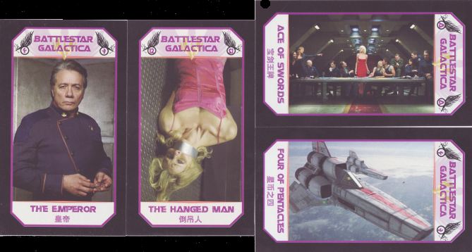 18 March 2010 Yesterday I showed a deck produced by the Chinese card printing company, Poker Workshop, deck number 208. Today I want to show you deck number 205 from the same publisher. This is the Battlestar Galactica Tarot, a full set of 78 cards using publicity photographs from the show. Whether this is an authorised tarot is uncertain, but it will probably be of interest to Battlestar Galactica collectors. There is some attempt to associate the photographs used in the Majors with the appropriate idea of the arcana, but this seems to break down in the pip cards, though the court cards use characters from the show. I have not watched this television show so do not know the plot lines or the particular qualities of the characters. There are quite a few tarots that have been issued either officially or unauthorised in association with television shows, and this seems particularly common in the Far East. Indeed, there, doujinshi or fan art is tolerated and even encouraged by some production companies, as they see it as free publicity. This deck has will probably have little interest to tarot collectors, except perhaps someone like myself, attempting to have as comprehensive a collection as possible. Some of the cards here are in landscape format. One particularly caught my eye, the Ace of Swords, where the cast are posed to somewhat mirror Leonardo's Last Supper mural.