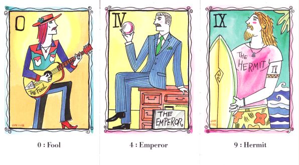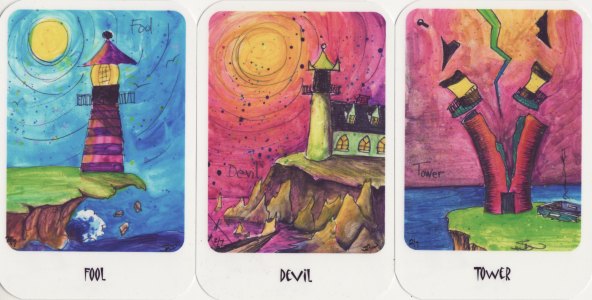 1 May 2010 I always wonder what new tarot idea Beth Seilonen will come up with next. This time it is lighthouses. We have already seen their appearance in her Maine Tarot, but now she gives them a tarot personality in her Funky Lighthouse Arcana. There really should be a Beth Seilonen appreciation society. It would be small, however, as she is very generous to those who collect her tarot cards by only printing small editions. This one is only 7 copies. An edition that small gives collectors added value. I have almost all her productions. I am sure in the years to come, people who missed out on her editions will regret not buying them. They are not expensive. If I ever managed to have a dedicated exhibition space, I would have a exhibition dedicated to her work. Looking through my Seilonen tarot drawer I see I have 27 of her decks. These show her various drawing and painting styles, and always her quirky sense of humour.