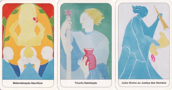 6 June 2009 I have now received an Egyptian Tarot produced in Brasil, the Tarô Egipcio. The watercoloured paintings are by Auri Campolonghi Gonella and appear to be based on an interpretation by Marco Daffi of the symbolism of the Bembine Table 'Disposizione dei Trionfi in rapporto alla Tavola Bembina' Kemi-Hathor, Volume 14, N. 79, January 1996. The artwork is rarther modern and I cannot immediately see the connection with the Bembine Table. The 22 cards are not numbered and do not bear the traditional arcana names, but instead are labelled "Renovacao-Neutralidade" and so on. Some are immediately recognisable as tarot arcana but others are a little more obscure.