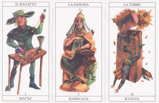 17 February 2010 Some days the world comes to my door, courtesy of the Post Office. Today I had one of the few visits from Bulgaria. This is the Arcani Maggiori Tarocchi. I have absolutely no further information as I cannot read a word (or even a character) of Bulgarian. The art is in watercolour painting using quite muted tones. The imagery keeps close to the established tarot major arcana forms but with some interesting variations and new ways of representing the symbolism. The packaging reminds me of the early Lo Scarabeo Tarocchi d'Arte series.
