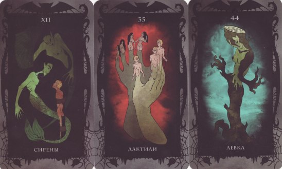 29 April 2010 I recently bought five Russian decks from a dealer in Moscow. Among these is the rather stylish Demonic Tarot of the well known tarot creator Vera Sklyarova, whose work is well sought after in Russia and fetches high prices. No longer are Russian tarots to be found for a few dollars ! I have, I believe, all of Vera Sklyarova's decks. These are an essential building block for any Russian Tarot collection. The Demonic Tarot is a 78 card deck and comes in a double-pile flip top box with a small booklet in Russian. The predominantly dark cards have some interesting imagery, such as the human form metamorphed into a tree, and the rather striking grasping hands with their male and female finger tips. Though a demonic tarot the imagery is not, to my mind, in any way disturbing, but rather classic and stylish.