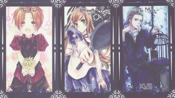 29 November 2009 The titles of tarot decks are often intriguing. I could not hold myself back from buying a Taiwanese tarot entitled Extreme Rain. This is a gift tarot issued with a self-published novel of that name. Only 10 cards were provided at random with each purchase, so people had some problem in collecting the whole set. The tarot itself has some rather fine manga art. The artist uses the device of soft backgrounds with the faces of the characters sharply drawn. The imagery closely follows the estabished tarot images, with amusingly, Strength being depicted as a woman wielding a frying pan. The Moon has a bit of a departure showing a young man with a birdcage. Perhaps some of the imagery relates to scenes from the novel. This I will probably never find out. An email correspondent has now informed me that the cards' characters are actually based on the web-manga Axis powers Hetalia . Note that "The fool" looks like the character N. Italy, "Strength" is Hungary and "The moon" is Germany.
