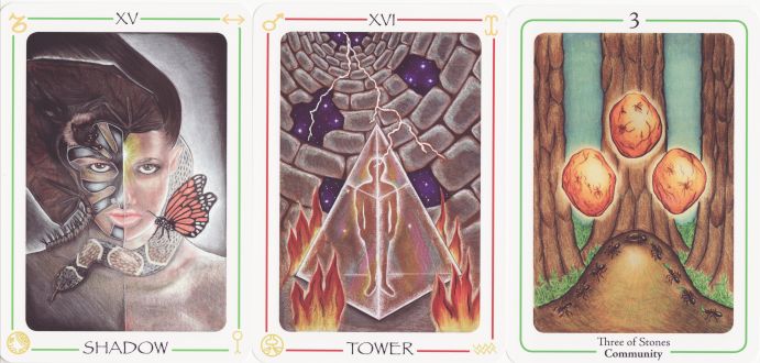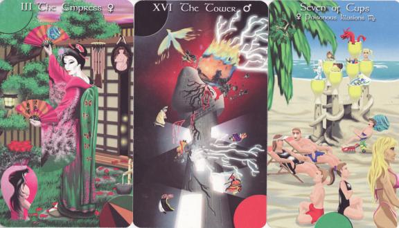 1 December 2009 The Kingdom Within Tarot has been created by Juno Lucina with artwork by Shannon ThornFeather. These appear to be created using a computer painting program. The imagery is eclectic, drawing on all sort of religious and esoteric ideas. The 78 card deck is fully illustrated and though the imagery on the pips does draw on Pamela Colman Smith's ideas, in many cases it departs from these and adopt different imagery. The Empress is classic in its simple image, the phallic Tower is struck by a flaming earth or planetary globe, while the Seven of Cups has a seven towered sand castle. The artwork is quite creative in places but the rather limited modelling of the human forms will perhaps not suit everyone.