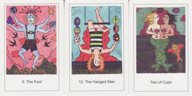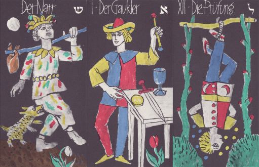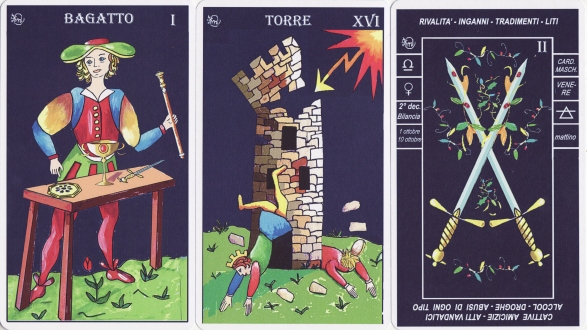 25 February 2009 Today I picked up from the Post Office a packet containing an Italian tarot in a rather naive style of artwork, the Tarocchi Carlotta, issued in an edition of 100 copies. This seems to be based on the Oswald With designs. The 22 Majors have been painted in watercolours by the clairvoyant and tarot reader Carlotta.