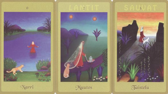 25 August 2009 It is cats again. Yet another cat tarot joins my collection. This one is rather special (though, in fact, they all are) in that it comes from Finland. There are few Finnish Tarots. I have two others. I would love to hear of any other tarots from Finland. Anyway, this Kissatarot is a full 78 card deck. The pips are emblematic, but do not follow the classic Rider-Waite imagery. In each image a cat or cats often appear as curious onlookers and companions rather than being at the centre of the imagery. Strangely on some cards the cat is accompanied by a friendly raven or crow. This is a fine and subtle deck.
