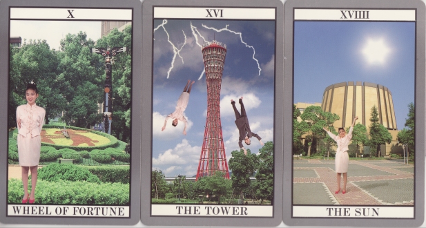 10 August 2009 Today I received a copy of the Kobe Tarot. This is a photographic tarot, in which two women pose against various landmarks of the City of Kobe in Japan making some link with the standard tarot images. The Tower for example, uses the Port Tower as a backdrop for the two young Japanese women to make their phot`ographic trick of falling from the tower. It is competantly done but not a significant tarot creation, however, I was very surprised to find in the documentation that it was published in 1991, so that does give it some historical import. This should not be confused with the Kobe Tarot created by the Slovenian Boris Kobe in 1945 when he was a prisoner in the Allach concentration camp in Nazi Germany.
