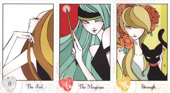 4 February 2010 The Japanese magazine publisher, Eastpress, issues a glossy, well produced monthly magazine, a Love and Fortune Calendar book targetted at young women and full of horoscopes, crystals, palmistry and other such divination. The issue for August 2009, contains a rather stylish tarot produced by Ryuichi Izumi with illustrations by Hitomi Nagao. Luckily I was able to get a copy before this went out of print.