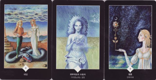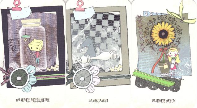 24 February 2009 There is a growing body of Korean tarots. Many of these are directed towards a younger audience. The Tarot Card Diary is such a production, consisting of an illustrated diary together with a set of 22 tarot cards. The images are rather sweet. I liked the image of the Hermit in his glass jar, complete with a light bulb. Death is nicely represented as a checkmate, while the Sun has a sunflower.