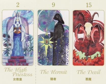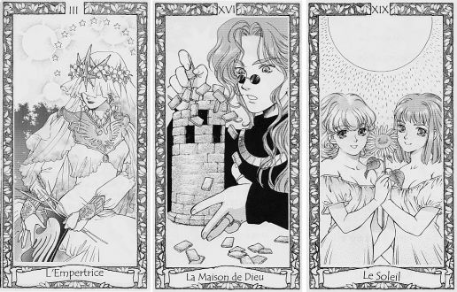 23 September 2009 There are always obscure and almost unknown tarot items to discover. I have just received the Animedia Tarot which seems to have been issued as a gift tarot in a Japanese magazine some 20 or more years ago. The 22 card deck seems to be based on a game and the company may have been an earlier incarnation of the present day large multimedia publishing group e-animedia. The artwork for this earlier tarot is by a number of artists known in the computer game and manga arena, Takayuki Goto, Toyoo Ashida, Mutsumi Inomata and Hatsuki Tsuji. Some of the artwork is quite conventional tarot imagery, but I found Death and the Devil rather cute, and the Hermit seems a bit too charming to be living his life isolated on his own.