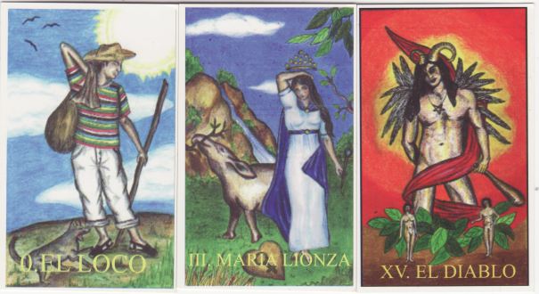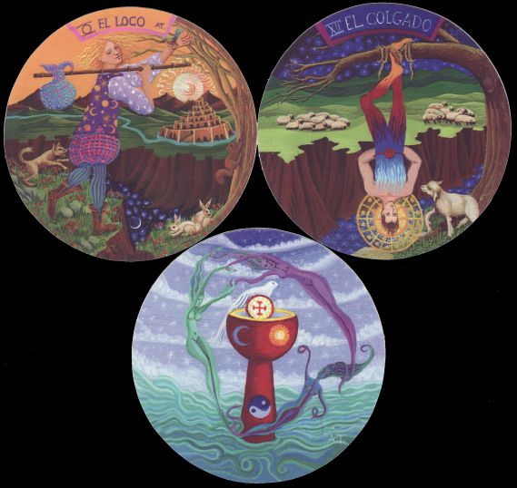 15 February 2010 I like to keep the South American part of my collection as comprehensive as possible, so it was a great delight to be able to buy a copy of the Thayer Tarot from Chile. This was created by the artist Alicia Thayer and comes in a large box with a comprehensive book in Spanish written by Jaime Hales describing each card. These are large round cards in deliciously saturated colour. I paid a high price for this deck as I suspect it will be very difficult to source suppliers in Chile, but as it is a truly delightful work of art, I was happy to pay this.