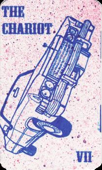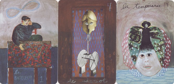 27 April 2010 Marie-Claude Bouthillier, the organiser of the Tarot of Montreal exhibition, has herself produced a fine collage tarot. the Tarot of Lady McBouth. We often find collage decks can be, in some people's hands, merely a haphazard accretion of images, so it is a delight when a trained artist brings her insight and vision into the choice of material used in the compositions and thus creates a coherent set of images. The Chariot, for example, references the well known sculptural piece by Giacometti, which I remember seeing at an exhibition of his work in Edinburgh a decade or more ago.