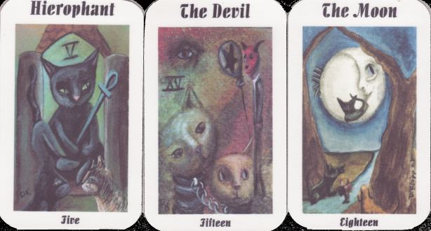 13 February 2009 I have been working for the last three weeks almost exclusively on the catalogue/book to go with my Art of Japanese Tarot Exhibition. Thankfully, now most of this is now completed. It is extremly difficult for a non Japanese speaker to research this material, and even to identify the artist/illustrators. I do have many rather obscure Japanese tarots that one just cannot locate any information about. Working on this exhibition has been very useful for me, as I have been able to appreciate in depth the amazing breadth and quality of the artwork to be found in Japanese tarot. Even giveaway decks in magazines can exhibit great skill and original thought on the part of the artist. By early next week the catalogue will be in the hands of the designer and I will have to start making up the exhibits - a considerable task as sample cards from many decks have to be mounted in frames, which could take up much of March. This project has been about as large a one as I can undertake without substantial help. It has absorbed hundreds of hours of my (unpaid) time). I hope it will make some impact on the art world and enable art historians to look at tarot as a vehicle for art, and also to see tarot art as documenting the social history of our era. Of course, an exhibition is a fleeting ephemeral thing, and will rapidly fade from view, but I will be left with the catalogue. I know many people in the tarot community see me as an outsider to tarot, as I have no interest in divination, and I don't expect this exhibition will endear me to them, but I do want to make it known that tarot is not just a fortune telling game with cards, but a vehicle and medium for art. 3 February 2009 I recently obtained another cat tarot, the Mystical Cat Tarot by Debra Klopp-Kersey. This is a limited edition of 100 copies using Debra's paintings. In a year she has produced three tarots the Crow Tarot, the Clown Tarot and now her new cat tarot. She is a prolific artist and creates dolls, sculptures as well as some rather wonderful surreal paintings as well as her tarots. People should check out her website at www.nannynortonprims.com if they want to see her artworks and buy one of her tarots.