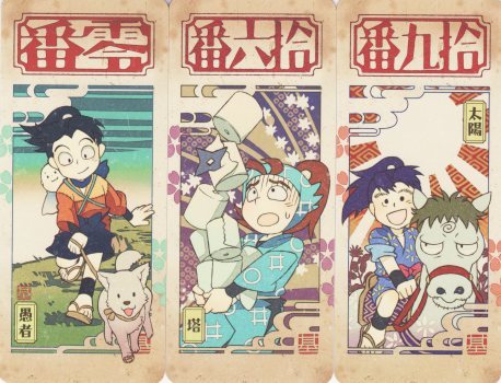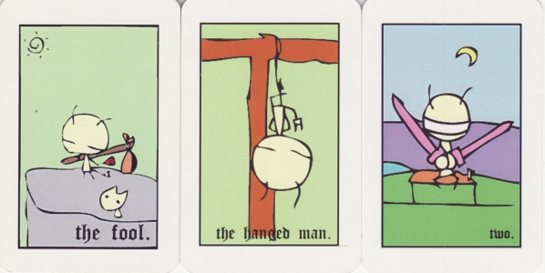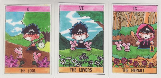 28 February 2009 There are not that many self-published Japanese tarots, but another one fell into my hands recently. This is the Ninja Boy Tarot published in 2008. The imagery is rather cute and keeps close to the established tarot archetypes. Here are the Fool, the Tower and the Sun. I am not sure if it is based on a particular version of the computer game or some manga based on it.