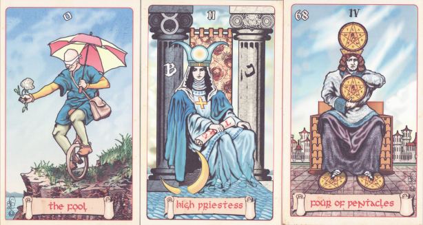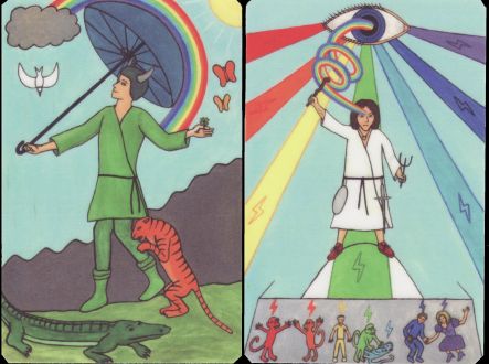 23 February 2009 I have now acquired a copy of the Tarocchi Buddhisti, issued in 1995 in Turin by the Libreria Editrice Psiche. This was created by three people, Sandra Parolin, Paravarto Viglierco and Gianpaolo Fiorentini. It is not a standard tarot, as it has 33 cards and though some cards echo the image of the Tarot, others are entirely different in conception. The first 22 cards are emblematic, but the final group of 11 follow a different symbol structure. I am not entirely sure what is essentially Buddhistic about the imagery on the cards. It supposedly maps out the path of liberation in Buddhism, and the cards were not intended to be used for fortune telling but for exploring the path to enlightenment. Here are three of the cards which reflect tarot imagery.