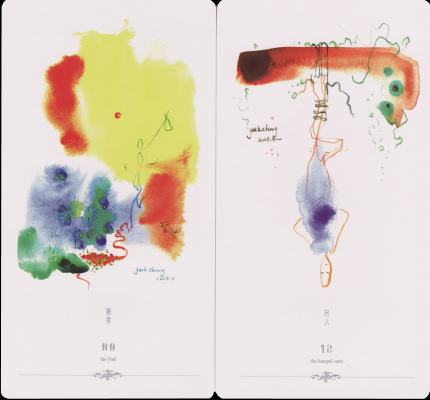 18 January 2009 Tarots can be among the most obscure of artworks. One can usually find information on the internet about any, even a quite poor, novel or piece of music, but some tarot creations remain intractable and almost invisible. I recently bought a rather beautiful art tarot, which I assume was self-published by the artist, entitled the Poetry Attitude Tarot, created in 2008 by Jack Chang in Taiwan. The artwork has some simple line-drawings (seemingly using a brush) with some strong unmixed watercolour (or water based inks) applied in the background on wet paper so as to produce beautiful featherings. I found it rather delightful and immediately went to Google et al, to find out more about this deck and its creator. Zilch! So I have this rather wonderful deck, but know nothing about it.