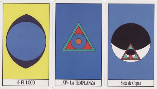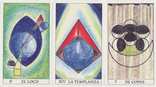 5 March 2010 The Tarot of Cosmic Consciousness by Barbara Bruch arrived in a big solid box with a 231 page extensively illustrated book. The imagery for the 78 card deck is abstract, often relying on geometrical forms, and this is explained and amplified in the book. Imagery, allegory and narrative is here dissolved into pure abstraction and archetypal cosmic forms.