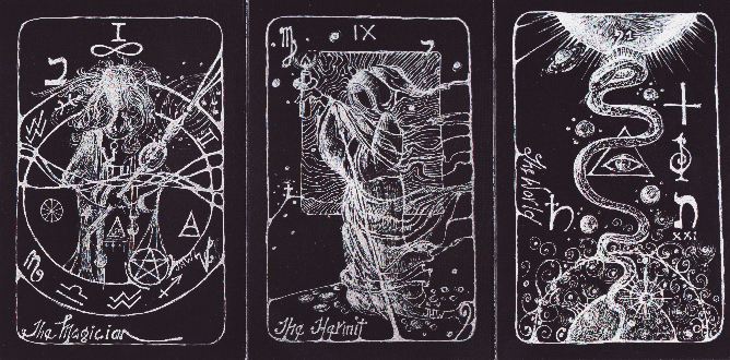 7 April 2010 The Fuller Tarot created by Maggie Fuller arrived a few days ago with a large heavy workbook. The 22 card deck is in black, grey and white. I am a bit perplexed with her choice of imagery for the Devil card, which seems merely to show a village of houses on the side of a hill. The Magician also puzzles me, with the tree-like figure holding a boat above its head, though here we have some of the familiar symbols of the tarot Magician, pentacle, sword, infinity symbol, chalice, etc.