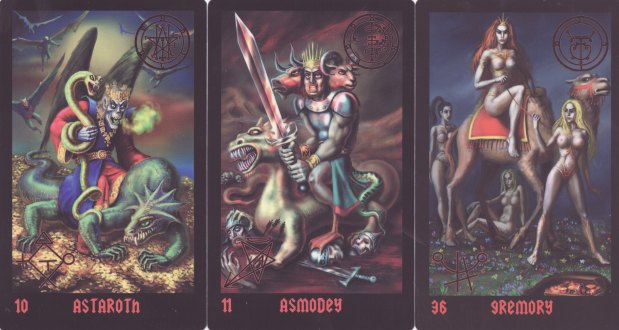 30 April 2010 I rarely buy sets of cards with no tarot structure, but recently I was tempted by a Russian deck the Tarot of Lucifer (or perhaps Luciferic Tarot) by Amanar Ingvar. It comes in a large box with a book and the set of 105 cards which are named after the demons of the Goetia, or the Lesser Key of Solomon. The imagery in fantasy art style incorporates many dragons, winged beings, naked women and multi-headed figures. I don't usually buy non-tarot structured cards, but I could not let this one get away. No doubt as soon as the edition is sold, it will be almost impossible to find. The imagery draws upon the classic work the Dictionnaire Infernal by Collin de Plancy first published in 1818, which has engravings for over sixty of the demons.