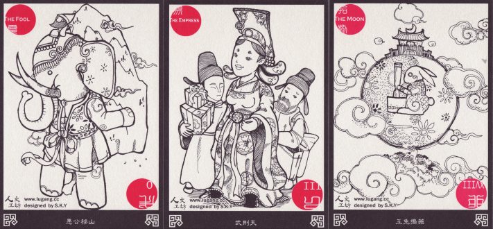11 August 2009 The Shen Zhou Tarot is self-published by a Taiwanese graphics artist who uses the name SKY. It is rather well printed in black line on a silver background, with the titles in red circles. The original pen drawings are beautifully conceived, and show us the artist's subtle sense of humour. Thus the Fool is an elephant carrying the mountain on his back rather than being about to step off a precipice. The Moon has a rabbit at its centre seeming to be pounding something in a mortar. We recall that in Chinese mythology, the Jade Rabbit was seen in the markings of the moon as a rabbit pounding herbs in a mortar to make the Elixir of life for the Moon goddess Chang'e.
