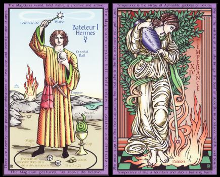 1 June 2009The latest issue of the Tarosophist International edited by Marcus Katz is now available. It includes a review of the Art of Japanese Tarot exhibition. You can buy a copy from the Tarot Professionals website www.tarotprofessionals.com. This has a cover featuring Emily Carding's artwork for her Tarot of the Sidhe which I published a few years ago. The full 78 card deck is now to be published by Schiffer books. I still have a few copies remaining of my limited edition of the majors. I expect this will now become quite collectable. You can see copies here. 28 May 2009 In the last few days I have begun work on printing and laminating the next tarot in my series. This is the amazing esoteric and art tarot Ithell Colquhoun created in 1977 when she was 71 years old and about ten years before she died. This is the first 78 card deck I have ever done, and judging by the amount of time it will take to produce, probably the last. It requires four times the number of hours I have to invest in making a majors only tarot. I am going to do the work in two batches of 50 decks, to cut the amount of time. Even so, the lamination and cutting of 50 decks will, I expect, take over two solid weeks of work. I was very lucky to have been in touch with Ithell Colquhoun back in the early 80s when she contributed a couple of articles to my Hermetic Journal magazine. Producing her Taro is a kind of tribute to this amazing surrealist artist, writer and esotericist. Sadly, I expect sales to be slow. No one seems to be as excited about this publication as am I and the editor Richard Shillitoe. I suspect, however, in five or six years time, when the edition is sold out, I will get moaning letters from people wanting copies. People always seem to leave it to the last minute when buying limited editions, as I find with the books I produce. 27 May 2009 Robert Place has produced a number of well known tarots - The Alchemical Tarot, The Tarot of the Saints, The Angels Tarot, and The Buddha Tarot. Now he has issued the Annotated Tarot of the Sevenfold Mystery. This is in the form of 22 large 'cards' 8.5 by 5.5 inches (216 by 140 mm), intended more for instruction than divination. The inspiration for the designs was the Pre-Raphaelite painter Burne-Jones. Each of the Major arcana is symbolically explored through a focus on the seven classical planets, and the various symbolic components of the design are labelled with their esoteric meaning and significance.
