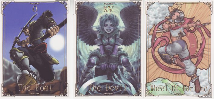18 August 2009 Today I am rather angry. Someone, entirely unknown to me, emailed asking me to provide them with scans of tarots in my collection. Seemingly an innocent request. I politely wrote back saying that it was not my policy to provide scans of copyright material. This person immediately wrote back again asking for scans of some rare items in my collection. I was so annoyed by this. I had made it explicit in my first reply. This person seems to think they have the right to acquire scans of rare tarots that I have had to pay hundreds of dollars to buy. Who knows what they would want to do with these. Some people nowadays are just so unprincipled to think they can demand such a thing from me. Such a selfish, unpleasant, untrustworthy person to have the gall to write back to me a second time ! I expect, but no doubt will not get, an apology. If they read this posting, they will probably shower me with a load of abusive emails instead. Sometimes people really disappoint you with their selfishness. 17 August 2009 Soul Calibur is a game in the Soul series of computer games developed and produced by Namco. I now have a tarot based on this fighting game. This would appear to be a self-published Doujinshi or fan art tarot. A rather fine example of manga style imagery.